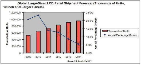 - 2011年全球大尺寸液晶面板出貨量將僅增長14%