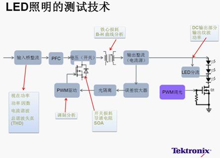 要達到高品質的驅動電源設計標準,就需要進行全面的測試測量分析,如圖1所示,LED照明測試主要包括5個部分:電源質量、諧波、功率開關器件測量、調制分析以及驅動輸出參數測試。