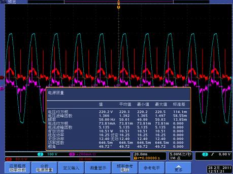 測量驅動電源的輸入功率、功率因數和諧波有很多方法,使用具有電源分析功能的泰克示波器產品可以輕松實現(xiàn)這些電能質量測量。使用一路通道測量輸入電壓、一路通道測量輸入電流,配合示波器內置的PWR電源分析軟件,所有的電能質量相關參數可以直接顯示在屏幕中。