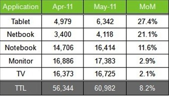 - 2011年5月份大尺寸面板出貨量為6,098萬片,較4月份增加8.2%