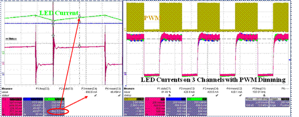 圖3:a) LED電流(綠色波形)和并聯變阻器上的電壓(紫紅色波形); b) LED燈串上的均流控制