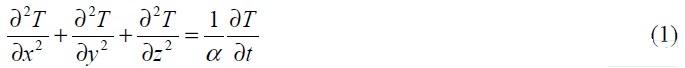 其中:T 為溫度;t 為時間;x, y, z 空間三維坐標系;α 為熱膨脹系數,α 滿足方程:
