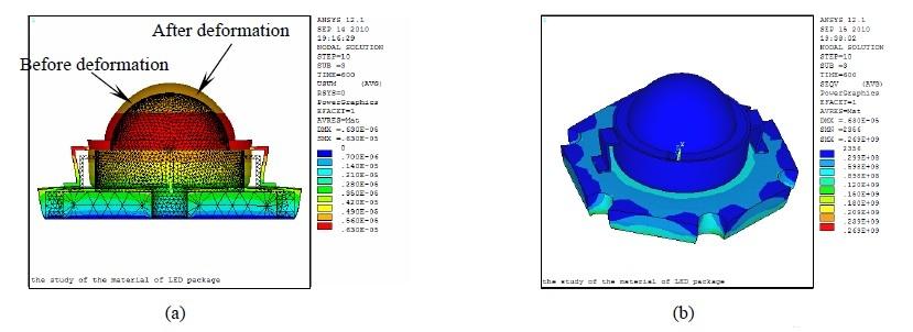 圖4 Lumileds 1 W LED 的熱變形云圖(a)和等效應力云圖(b)
