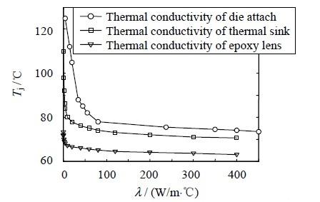 由圖可知,LED 結溫隨著熱沉和鍵合層導熱系數的變化趨勢類似,當λ 較小時,隨著λ 增大,結溫迅速降低;當λ 較大時,隨著各種材料導熱系數變化,結溫變化平緩。這是因為當λ 較小時,各材料的熱阻較大,而當λ 較大時,熱阻減小,熱量能順利傳出,此時導熱系數不再是影響整個系統傳熱效果的主要因素。由于LED 傳熱并不經過透鏡,所以透鏡的導熱系數對LED 的結溫變化影響很小。