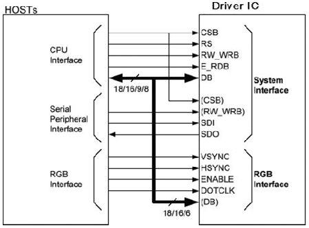圖2 顯示了一個典型的主控端的連接方式,CS、RS、WRB、RDB 是控制型號,分別是片選信號、數據或命令、寫/ 讀信號,按照一定的時序控制,數據得以傳輸,畫面才能正常顯示。