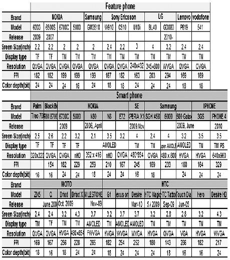 市面上所說的1,600 萬色即24 位(bit),26 萬色即18 位(bit),而65K 色也就是16 位(bit)。;圖1中顯示了市面上部分手機的顏色,可以看到,目前大多數手機廠商特別是手機大廠會選擇24bit,也即1,600 萬顏色。