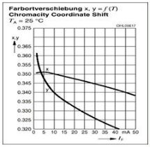 由圖中可以看到,如果正向電流從350mA降低8.75倍到40mA,其相對發(fā)光強(qiáng)度將從100降低到20。降低將近5倍。顯然這是完全不能允許的。所以一定要把電流恒定。