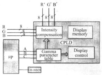 為了補償LED 因溫度引起的亮度變化,LED 顯示系統增加了亮度檢測電路。實驗發(fā)現,以20 ℃溫度間隔對色彩進行溫度補償時,能基本上滿足圖像的觀看質量。為此,系統以常溫為基礎,每隔20 ℃給出相應基色的Gamma 校正參數。對于- 20 ℃~ + 80 ℃范圍,每個基色給出供5 種不同的Gamma 參數以補償亮度的變化。圖6 給出系統的溫度檢測電路和相應的控制Gamma 參數的電路框圖。利用溫度傳感器DS18B20檢測環(huán)境溫度的變化,當環(huán)境溫度到達設定溫度值時,通過微處理器的ARC 3 個I/ O 線輸出5 個溫度狀態(tài)中的某一狀態(tài)值給CPLD。在CPLD 內部設有RGB 三基色(3 ×4 + 1 = 13)13 個(常溫時采用一個標準的Gamma 參數校正,在其他溫度下,每個基色一個校正參數) Gamma 值的參數表,從表查出分別對應RGB 的3 個Gamma 值提供給亮度控制電路和顯示控制電路。