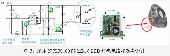 還有一款MR16 LED方案是用于降壓型應用的NCL30100,它是能效大于95%的LED驅動器控制器,開關頻率高達700kHz,不需要輸出電容,Vcc工作范圍從6.35至18 V,可以驅動一個或多個大功率LED,主要用在MR16 LED照明、環境燈照明、太陽能LED、交通照明、室外照明和LED光條等應用。其PCB非常小巧,可以裝入MR16燈的燈座內。NCL30160的遲滯控制特性可在負載瞬期間提供快速的回應,無需小型信號控制環路補償元件。保護特性包括可利用電阻設定LED電流、LED短路保護、欠壓鎖定及熱關閉。