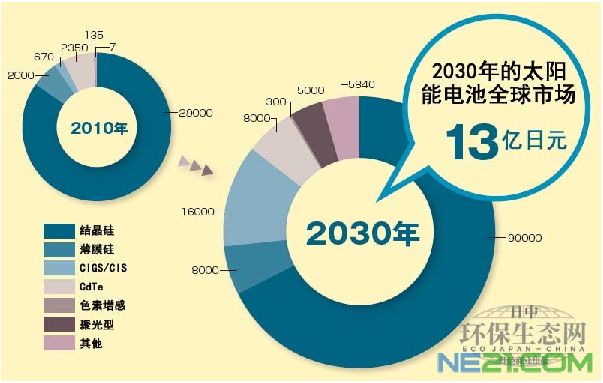 該調(diào)查的特點在于根據(jù)太陽能電池的不同種類進行預(yù)測。轉(zhuǎn)換效率及性價比較高的結(jié)晶硅太陽能電池到2030年將擴大到9萬億日元,約為2010年的3倍。約占整個市場的7成,依然是主流產(chǎn)品。