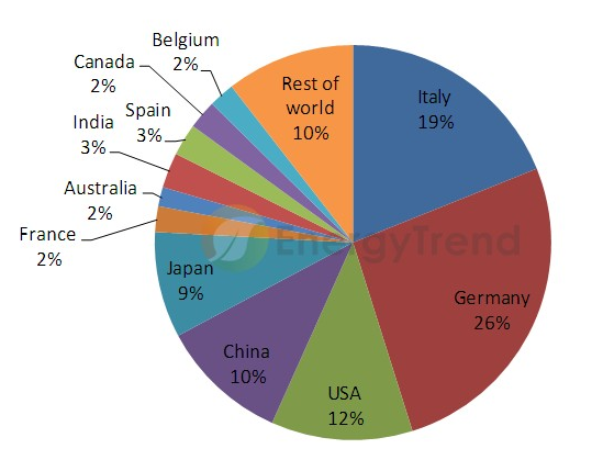 根據EnergyTrend的預估,2011年全球太陽能市場安裝量將來到19GW,但產業整體的庫存量(包括成品與半成品)將高達10GW左右,因此就產業鏈的供需狀況來看仍是處于嚴重供過于求。展望2012年,EnergyTrend預估全球市場需求量約維持在19GW左右,需求無法成長的主因在于歐洲市場的需求受到政策調整的影響,意大利、德國、英國等國的需求呈現下滑的態勢;另一方面,亞洲市場的需求受到政策的鼓勵而出現成長的狀況,但像中國、日本、馬來西亞、與泰國等,2012年的需求仍處于小幅成長的狀況,EnergyTrend預估至2013年市場才會出現強勁的成長。除此之外,北美與印度市場雖然受到矚目,但這二大市場仍有問題需求解決。在北美市場來看,美國市場受到Cash Grant法案將于2011年底到期的影響,2012年將以Tax Credit法案接手,然EnergyTrend認為Tax Credit對于推升市場發展的力道有限,使得2012年美國市場處于混沌不明的狀況。而在印度市場方面,雖然National Solar Mission的推行讓印度市場具有龐大的潛在需求,但中央與地方政府的執行效率與財務狀況,再加上在地自制率(Local Content Requirement)的推行,將是影響印度市場未來發展的不確定因素。