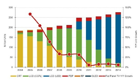 2004-2014全球電視按技術別出貨量及預測(單位:百萬臺)