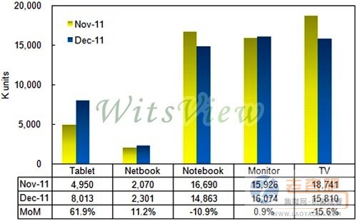 監視器面板出貨量為1,607萬片,月增0.9%;筆記型電腦面板出貨量為1,486萬片,月減10.9%。平板電腦方面,WitsView指出,蘋果(Apple)新一代 iPad 3 面板,持續受到生產良率問題,造成目前供貨量依然受到限制,但華南地區對于山寨平板電腦需求,依舊強勁,整體平板電腦面板出貨較11月增加61.9%,出貨量來到801萬片。小筆電用面板出貨量則來到230萬片,較上月增加11.2%。