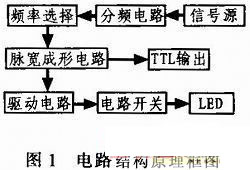 對水下成像系統而言,光源的選擇至關重要,光源的穩定性、均勻性、響應速度及其光波波長范圍是系統成像的關鍵。采用藍光LED所發出光光經過水介質——目標反射——水介質——接收光學系統,最終在成像傳感器(CCD,ICCD)上成像。這就決定了LED必須工作在快脈沖驅動方式下,目前市場上的驅動電路一般均丁作在慢脈沖驅動模式(μs量級),遠不能滿足我們的要求。因此,我們必須自己解決快脈沖驅動電路這一難題,尤其是實現以ns量級的大功率快脈沖來驅動大功率的LED。基于這種實驗實際需求,我們研究開發了此種快脈沖驅動電路。該電路的基本功能是產生低頻、快速、大功率驅動電流脈沖信號,輸出脈沖的頻率與周期精確度高,穩定性好,脈沖信號寬度在20~100 ns內分5檔可調,輸出在50 Hz的基準頻率下工作。脈沖信號通過驅動電路,輸出一個快脈沖信號驅動輸出電流開關,產生一個大電流脈沖信號驅動一個大功率LED。為了達到設計要求和目的,我們采用晶振電路產生高精度頻率/周期基準脈沖作為內置信號源,通過對基準脈沖進行多次分頻,產生所需頻率的輸出脈沖信號,這樣可以獲得頻率穩定的脈沖信號,同時實現了頻率選擇。經過分頻后的脈沖信號再經過脈沖寬度成形電路實現脈寬調節,然后經過電流開關電路,產生大電流脈沖,使LED發光。該驅動電路主要由以下幾個部分組成:信號源、分頻電路、頻率選擇、脈沖寬度電路、TTL輸出、驅動電路和電流開關電路。其框圖如圖1所示。