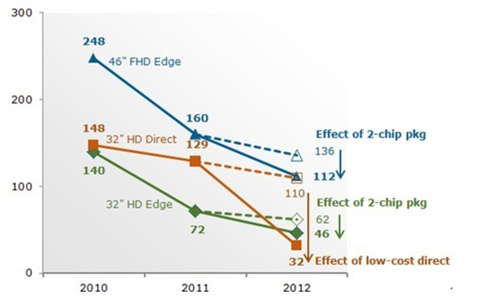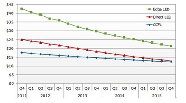 直下式LED背光源電視的材料成本與CCFL背光源的材料成本接近。NPD DisplaySearch預估以32寸液晶電視來說,直下式LED背光源的成本為CCFL背光源的1.3-1.4倍,而側光式LED背光源估計成本則超過CCFL背光源的兩倍。以40寸液晶電視來說,成本節省更顯著,低價直下式背光源材料成本減少近40元美金,而終端產品成本節省更可以達100美金。
