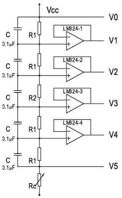 在圖1中,在各輸出端增加了運算放大器LM324。LM324是一個具有四運放的可使用正負電源工作的運算放大器。它的每一個運放都接成電壓跟隨器的形式,使得V1、V2等輸出端的驅動能力大大增強,可以大大改善LCD的對比度。電路中的Rc為10~20kΩ的可變電阻,在模塊對外部的接口處引出,可以隨時調整顯示的對比度。