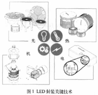 LED 的封裝技術實際上是借鑒了傳統的微電子封裝技術,但LED 有其獨特之處,又不能完全按照微電子封裝去做。整個LED 封裝工藝主要包括封裝原料的選取、封裝結構的設計、封裝工藝的控制以及光學設計與散熱設計,概括來講就是熱- 電- 機-光(T.E.M.O.),如圖1 所示,這是LED封裝的關鍵技術。