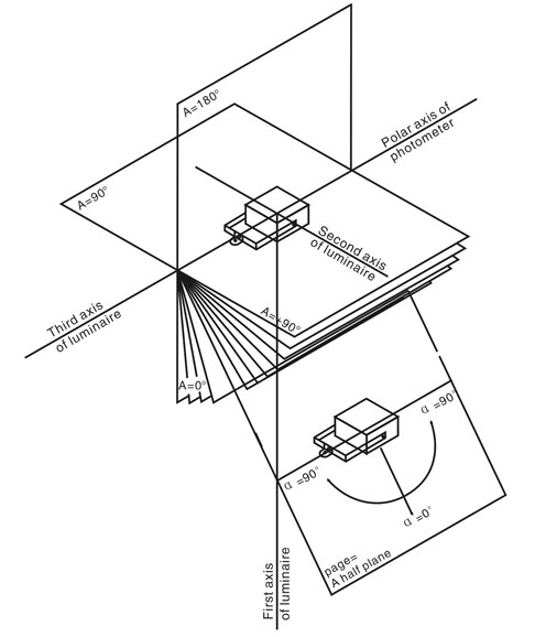 配光曲線儀可分為A-α、B-β、C-γ三種形式,詳見圖6~8。為確保量測時的光源擺放姿態即為使用時的姿態,僅有C-γ符合需求,LM-79因此規定僅可使用C-γ形式的配光曲線儀。C-γ型配光曲線儀包含移動偵測器探頭及移動反光鏡的類別。