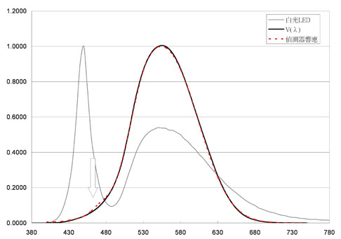圖5 白光LED多以藍光激發黃色熒光粉,在藍光波段(圖中箭號表示)處,亮度計探頭的視效函數(虛線表示)響應與CIE V(λ)匹配不佳時,差異的比例就會加大。
