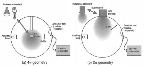 規范中定義使用積分球各裝置的幾何架構如圖3所示。共有兩種,一種為4π,另一種為2π。在4π的幾何架構,固態照明產品的總表面積不可超過球壁總面積的2%,例如,在一個2公尺積分球內,待測物若為一個球狀物,其直徑必須小于30毫米。若為線狀產品,其縱向尺寸應小于球直徑的三分之二。在2π架構,安裝固態照明產品的開口直徑應小于球直徑的三分之一。另外固定燈具的治具不可導熱,以避免影響球體溫度。