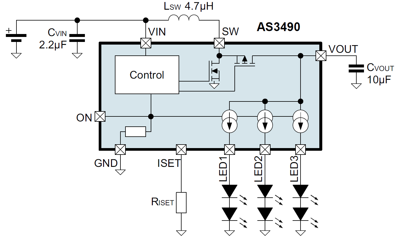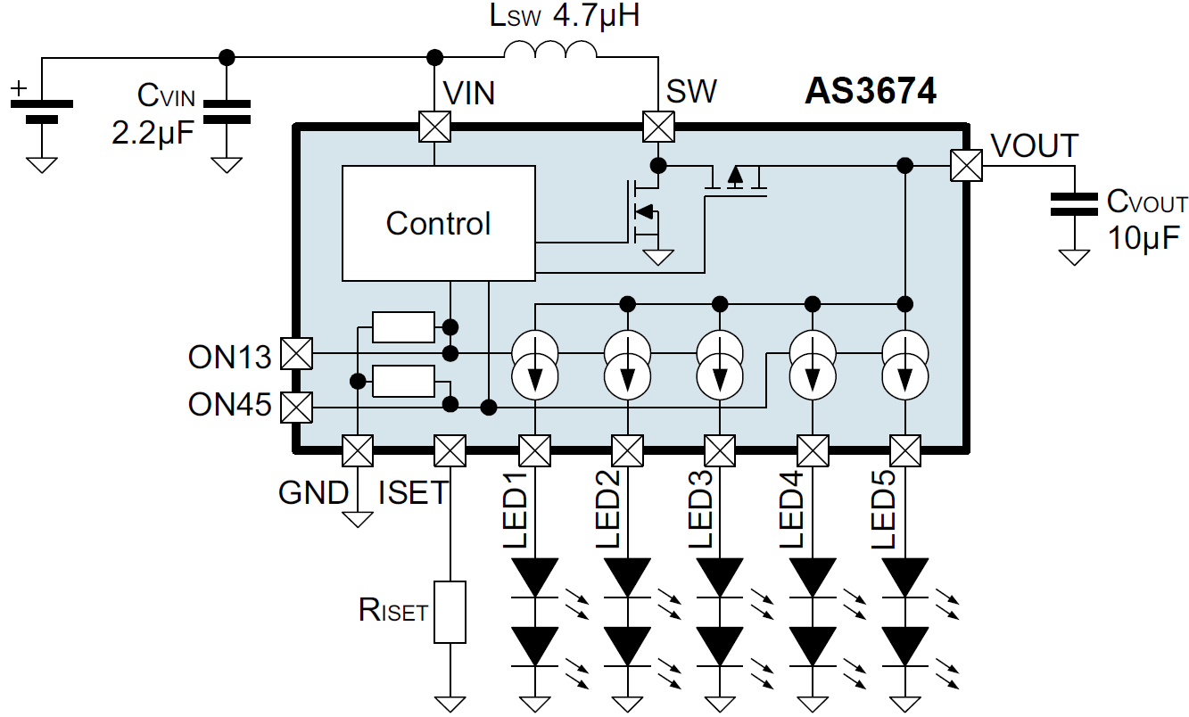 軟啟動(dòng)的特點(diǎn)使AS3674更容易集成到對(duì)噪音敏感的無線射頻系統(tǒng)中。AS3674由兩組輸入電路控制,也可用介于100-800赫茲的PWM電路控制,實(shí)現(xiàn)1:2000的調(diào)光比。單通道兩個(gè)LED的配置結(jié)合2 MHz的轉(zhuǎn)換器操作頻率,實(shí)現(xiàn)使用諸如4.7µH電感的微小外部組件并取得優(yōu)于競爭對(duì)手最高達(dá)6%的高效率。