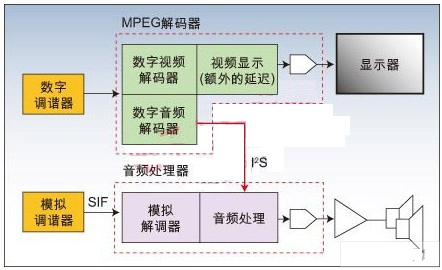 在從模擬電視向數字電視轉變的過程中,電視機也需要能夠同時處理模擬和數字音頻。模擬電視信號中的音頻要使用一個子載頻,而模擬調諧器通常有一個需要被解調的聲音中頻(SIF)輸出。DTV平臺通常有一個用于解調來自模擬調諧器的SIF輸出的模擬輸入端和一個來自解碼器的數字輸入端,后面的解碼器用于處理MPEG數據流中的視頻和數字音頻(圖2)。