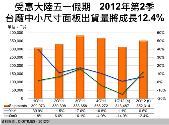 第2季為中小尺寸TFT LCD面板傳統旺季的開始,其中,大陸五一假期需求更是第2季的主要市場動力來源,DIGITIMES Research分析師楊仁杰分析,2012年第2季臺廠中小尺寸TFT LCD出貨量預估將為3.52億片,將較前季成長12.4%。至于年成長率,則受惠大陸手機市場,尤其是智能型手機市場帶動,加上臺廠打入國際大廠7吋平板裝置、教育學習機、打印機等應用,將較2011年第2季成長6.6%。