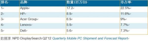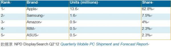 根據NPD DisplaySearch最新的季度Mobile PC出貨數量與預測報告初步調查結果,蘋果公司在2012年第一季出貨將近1,720萬臺Mobile PC,年成長率為118%。而約有80%的蘋果出貨來自iPad,第一季出貨量為1,360萬臺,年成長率達162%。