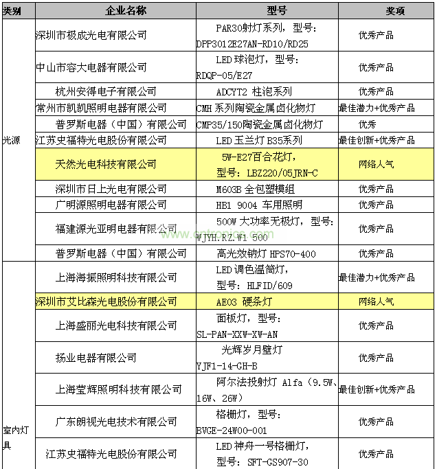 2012年6月9日,2012廣州國際照明展覽會開幕當天,主辦方組織20名終審專家對終審會議評選出來的獲獎候選產(chǎn)品進行現(xiàn)場的考核評審,最終確定35個優(yōu)秀產(chǎn)品獎,3個最佳創(chuàng)新獎、5個最佳潛力獎的獲獎名單;5個最佳網(wǎng)絡(luò)人氣獎是由網(wǎng)友海選出來的名單。