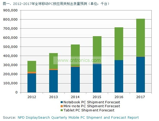 據DisplaySearch—平板電腦,如蘋果的ipad,預計將成為未來幾年移動PC市場的主要增長動力。根據NPD DisplaySearch季度移動PC出貨與預測報告Quarterly Mobile PC Shipment and Forecast Report,2016年平板電腦出貨量將超過筆記本電腦,移動PC(指包括筆記本電腦、上網本、平板電腦等)總出貨量將從2012年的3億4千700萬臺增長到2017年8億900萬臺。
