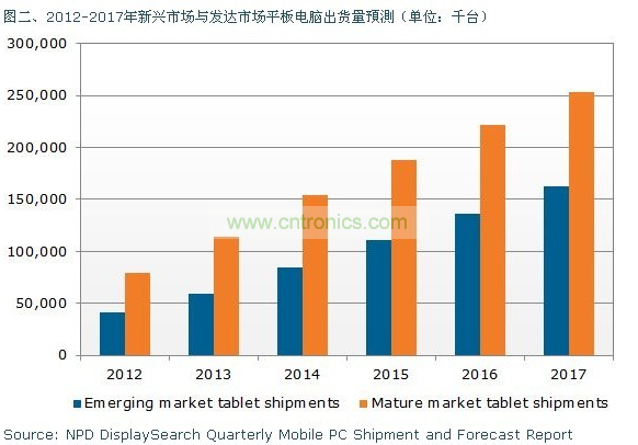 筆記本電腦出貨量預計從2012年的2億800萬臺增長到2017年的3億9千300萬臺,而平板電腦出貨量預計將同期從1億2千100萬臺增長到4億1千600萬臺,年復合增長率將達28%。平板電腦成長的主要動力來自于在發達市場的應用增長(包括北美、日本和西歐),2012年該市場平板電腦的出貨占比為66%,并且在整個預測期內占比也將保持在60%左右。平板電腦在發達市場的出貨量預計將從2012的8千萬臺增長到2017年的2億5千400萬臺。