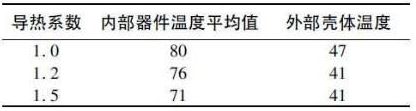 ( 3) 灌膠導熱系數對驅動電源散熱影響情況,由于電源的殼體結構已經確定,因此驅動電源的散熱主要通過膠體傳導,將熱量傳導到殼體,而后通過對流散熱。表1 是導熱系數不同的膠體的電源器件和殼體溫度情況( 輸入電壓~ 100 V,輸出48 V/3 A,環境溫度25 ℃) .