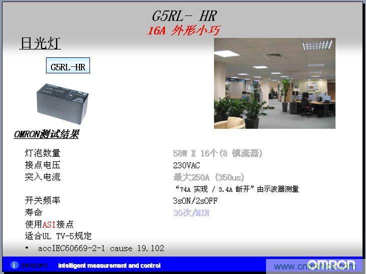 我們實際客戶應用的案例,我們在推廣客戶的過程中,形成了一些實際的應用案例,在實現照明系統和家電自動化的領域,在節能領域、自動化的領域現在是越來越高了,目前歐姆龍的繼電器在日光燈這塊直接的應用可以運用繼電器作為啟用的電阻。繼電器也就是高級一點的器開關。在模塊上面,也是用來控制鎮流器的。在另外一個人體、物體探照這塊,我們也會有MEMS非接觸系統的微溫度傳感器。按照設計的過程中,就是在信號繼電器和MEMS非接觸溫度傳感器繼電器上都有應用,但是還沒有成功案例,所以上面就打了問號。