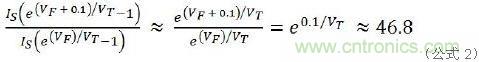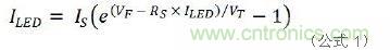下面是圖1a行不通的原因所在。在公式1中,IS、RS是常數,取決于LED產品本身,與VT是熱電壓無關。假設串聯電阻RS是理想值零,那么僅0.1V的VF變化就會產生47倍的ILED差異。