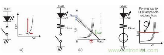現在我們來看看圖1b。添加一個限流電阻器RLIMIT來保護LED燈。由于有限流電阻器,因此該燈不會被燒壞。在視頻顯示器應用領域,這種方法在控制LED光強度方面仍然不夠好。LED曲線和RLIMIT產生的負載曲線可決定其LED電流值。如紅色或藍色標記所示,該LED和電阻器分別存在制造誤差造成的正向電壓變化及電阻變化。這些誤差因素會使LED電流(綠)產生不可忽視的變化。