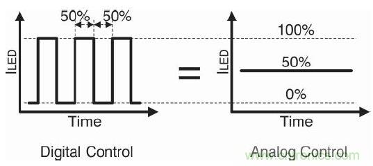 首先應決定使用數字控制還是模擬控制。前面已經介紹過,經過 PN 結點的總電荷數可決定光強度,因此數字和模擬方法均可控制光強度。圖3是數字和模擬法中的50%灰階控制。在總體256個色階的示例中,該50%表明了一個有128個灰階的目標。