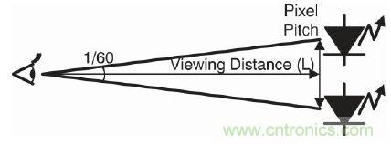 一套LED顯示系統包含大量的LED燈和一個大電源。設計系統時需要重點考慮LED燈的密度優化問題。LED 燈的該密度稱為每個像素的距離或像素間距。如果像素間距太密,一旦超出了人眼能識別的精度,它就不會改善影像輸出質量,而且會增加成本。人眼可識別的兩個單光源是在這兩點形成1個弧度的1/60(=1 弧分)時。