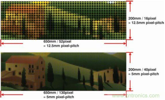 例如,5m視距的系統需要5mm像素間距來實現良好分辨率。另一個視覺實例如圖7所示,圖中展示了過低像素間距如何降低輸出影像質量。像素間距為12.5mm 的影像(上)看起來很粗糙,無法近距離辨識。但保持一定的距離觀看時影像開始變得清晰,與觀看像素間距為5mm的影像(下)類似。這個實例清楚地說明了視距與像素間距的關系。