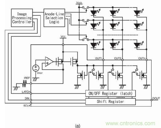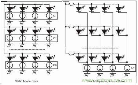 從圖2可以看出,LED燈的陰極采用當前市場常見的LED驅動器IC驅動。這里要討論LED燈的陽極驅動器電路。陰極采用恒流驅動器有優勢,陽極希望也只提供足夠的電壓。但仍需做出如何驅動陽極的重要決定!