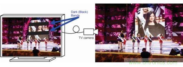 老式模擬電視通常在一秒鐘內顯示24張不同的靜態影像,幀速率為24。當模擬電視攝像機拍攝另一個模擬電視屏幕時,可產生由視頻影像與黑色條帶構成的斑馬紋混合畫面(圖9)。這種現象由同步電視攝像機和電視屏幕掃描率引起。在拍攝LED屏幕的攝像機采用時分復用陽極驅動器時,也會出現相同的問題。應用實例包括使用電視攝像機拍攝背景墻壁上由LED顯示器放大演員的舞臺影像或者用電視攝像機拍攝體育場中體育賽事比分牌或標牌等。要避免這個問題,LED顯示器現在需要比攝像機系統運行得更快,特別是在專用LED顯示器市場。
