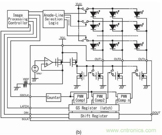 圖11b是采用PWM控制IC的系統,具有一個可參考時鐘計數器的灰階參考時鐘輸入端。另外,該IC還具有一組保存灰階邏輯代碼的寄存器。PWM 比較器可通過計數器和灰階 (GS)寄存器比較和生成PWM輸出模式。