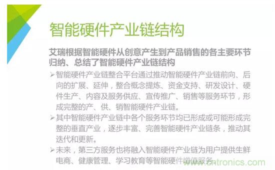 作為此次系列報告的開篇,京東智能與艾瑞對當前智能硬件的產業鏈結構,發布了行業報告《2015中國智能硬件產業系列研究報告——產業鏈圖譜篇》該圖譜對現階段的智能硬件的發展趨勢進行了劃分和定義,并對產業鏈的結構進行了分析。
