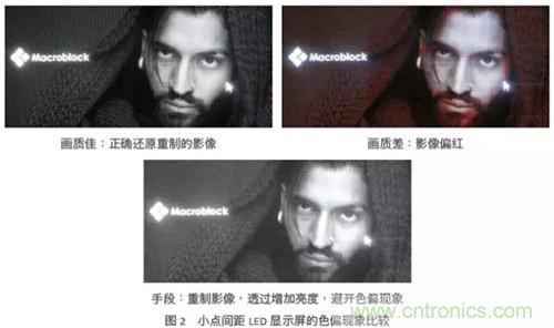 在室內(nèi)應(yīng)用中,LED顯示屏的亮度多介于300到1000尼特(nit),將此亮度轉(zhuǎn)換成LED順向電流,約當(dāng)于1~5mA,甚至小于1mA。因此,驅(qū)動(dòng)芯片的小電流集中度變得很重要。當(dāng)驅(qū)動(dòng)芯片電流精度不佳,小點(diǎn)間距LED顯示屏就容易出現(xiàn)區(qū)塊不均的色塊,然而為掩飾色塊這個(gè)缺陷,通常會(huì)采取提高LED電流這個(gè)手段,來(lái)增加顯示屏的亮度。但帶來(lái)的缺點(diǎn)是,當(dāng)觀眾注視這個(gè)LED顯示屏一段時(shí)間后,眼睛容易感覺(jué)不適。圖1所演示的是小點(diǎn)間距LED顯示屏,在使用不同質(zhì)量的LED驅(qū)動(dòng)芯片時(shí),重制圖像后的實(shí)際差異。
