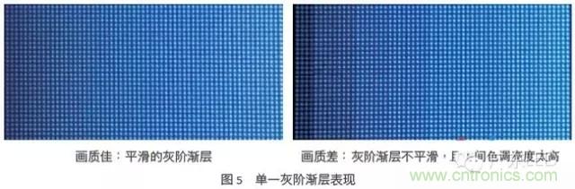 小點(diǎn)間距LED顯示屏為時(shí)序掃描式(multiplexed)的顯示器,非液晶屏幕的hold-type顯示器,所以刷新率對(duì)于小點(diǎn)間距LED顯示屏來(lái)說(shuō)相當(dāng)?shù)刂匾^低的刷新率不僅會(huì)使小點(diǎn)間距LED顯示屏觀賞起來(lái)有閃爍的不適感,容易使造成觀賞者暈炫,而且會(huì)使灰階漸層的效果不平滑。以圖4為例,右圖臉部的灰階漸層效果較左圖的不平滑,有類(lèi)似等高線的現(xiàn)象,從圖5的灰階漸層測(cè)試畫(huà)面也可以看出右圖的小點(diǎn)間距LED顯示屏的連續(xù)性比左圖的差。