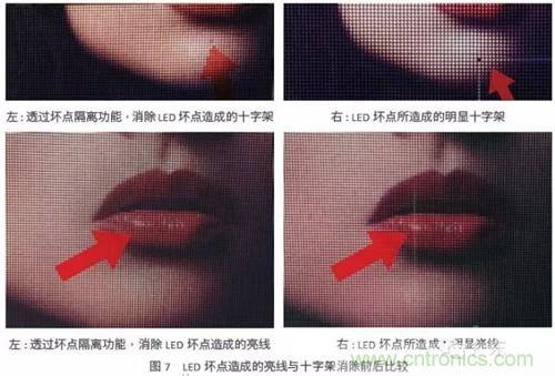 一個(gè)好的小點(diǎn)間距LED顯示屏必須要能消除因LED壞點(diǎn)所造成惱人的亮線或十字架現(xiàn)象,如圖7左圖所示。唯有采用具有“壞點(diǎn)隔離”功能(dead pixel isolation)的LED驅(qū)動(dòng)芯片,才能維持小點(diǎn)間距LED顯示屏的正常運(yùn)作,并可方便用戶彈性安排