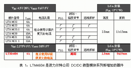LTM4604 是凌力爾特公司推出的最新 DC/DC 微型模塊(µModuleTM)穩(wěn)壓器,LTM4604 也引出了一個(gè)面向低壓應(yīng)用(2.375V 至 5V)的新器件系列。第一個(gè)器件系列由 6 個(gè) DC/DC 微型模塊穩(wěn)壓器組成,以較高電壓和較高功率的應(yīng)用為目標(biāo),而新推出的器件系列專門用于較低電壓和功率略低一些的應(yīng)用。此外,新器件系列采用的封裝小 40%。參見(jiàn)表 1,以迅速了解這些緊湊和完整的 DC/DC 系統(tǒng)的特色。