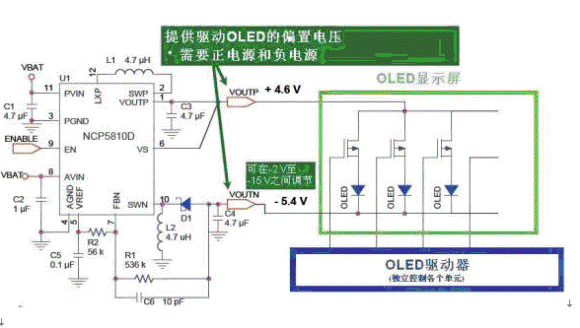 圖5:安森美半導體AMOLED穩壓電源IC NCP5810D的功能框圖。