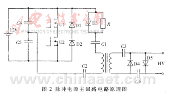 脈沖電源整個電路由主電路和控制電路組成。考慮到荷電噴霧基本上都用在室外,主電路的輸入設計為可用蓄電池供電的12V直流電壓,將它加在由電容C4、C5、IGBT大功率管U1、U2和高頻變壓器組成的半橋式逆變電路。控制電路采用PWM方式。控制電路輸出二路彼此絕緣、相位差180°并有一定死區的脈沖。這兩路脈沖分別控制U1、U2的導通和關斷,使得直流電轉換為高頻脈沖。高頻脈沖經脈沖變壓器升壓后輸出高壓高頻脈沖[2-3]。電路如圖2所示。