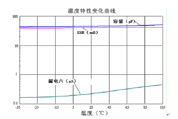 4. 溫度特性穩定,如圖1所示在-55~+105℃工作溫度范圍內,容量、ESR變化幅度小。