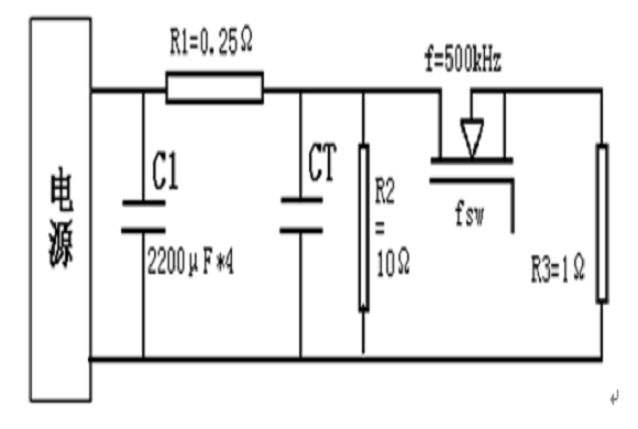 由于電子產品的工作電壓不斷地降低,而其功耗卻在增大, 這就要求DC/DC轉換器具有輸出電壓低和輸出電流高等特點。作為DC/DC轉換器或開關電源輸出電容,要求在開關管的工作頻率附近具有較低的紋波電壓。為了觀察PA-Cap在開關管一般工作頻率下的紋波電壓效果,進行了如圖3所示的測試,其中的參數示于表1中。